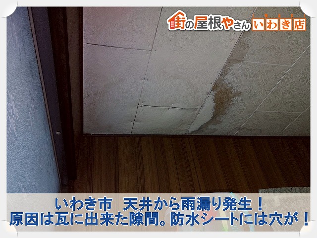 ✉ 街の屋根やさん明石・神戸店のメールでのお問合せはこちら みなさん、こんにちは!😊 街の屋根やさん明石・神戸店です! 大切なマイホームの外壁、なんだか最近、ツヤがなくなってきたな…とか、ひび割れはないけれど、なんだか全体的にくすんで見える…と感じ ...続きを読む2025/10/31 いわき市にて天井からの雨漏り。瓦の隙間から入り下地の防水シートが破けていた