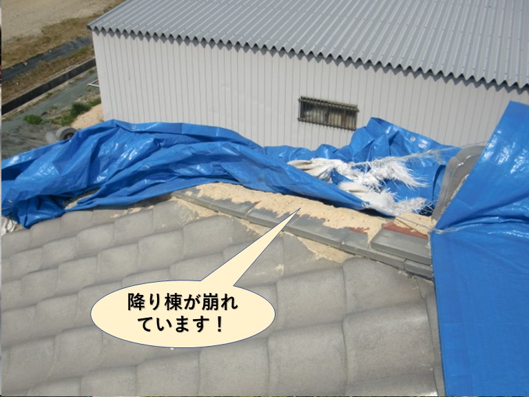 岸和田市F様邸の台風被害に遭った瓦屋根の修復工事で、降り棟の修復の様子をご紹介します。棟とは屋根と屋根の頂点の取り合い部分のことで、必ず隙間ができますので雨が入らないように瓦を積みあげています。降り棟は軒先に向かって降りる棟のことで、どちらも屋根面よりも突き出ていますので、風や地震の影響を受けやすく、F様邸の ...続きを読む2025/10/20 泉佐野市の陸屋根防水と躯体補修、外壁塗装の現地調査をご紹介