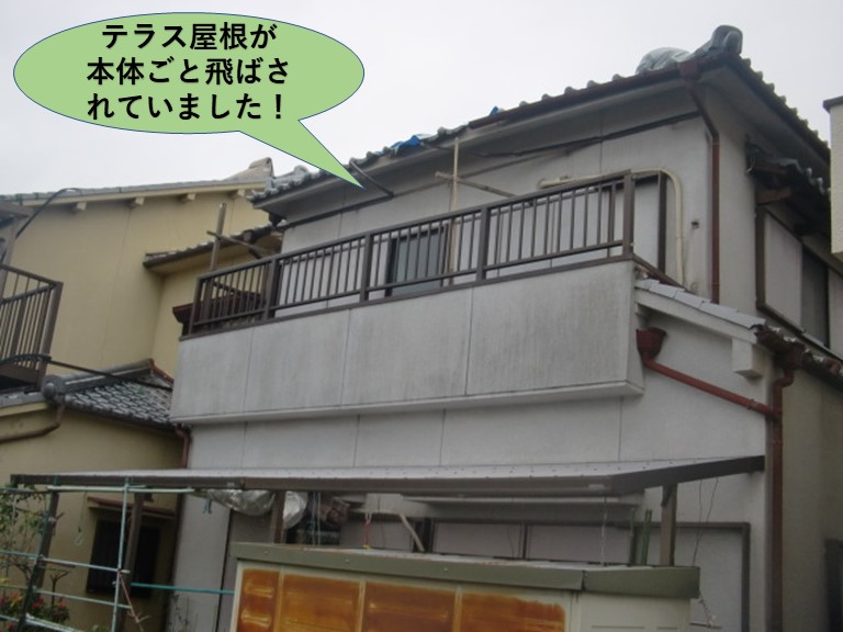 可児市のお客様より天窓から雨漏りしているとのご連絡をいただきましたのでお伺いしてきました。将来的にリフォームを考えているそうで今回の修繕は最小限に抑えたいとのご要望も最初に教えていただきました。 室内から見させていただきました ...続きを読む2025/10/15 岸和田市でテラス屋根が本体ごと飛ばされ軒先の瓦なども落下
