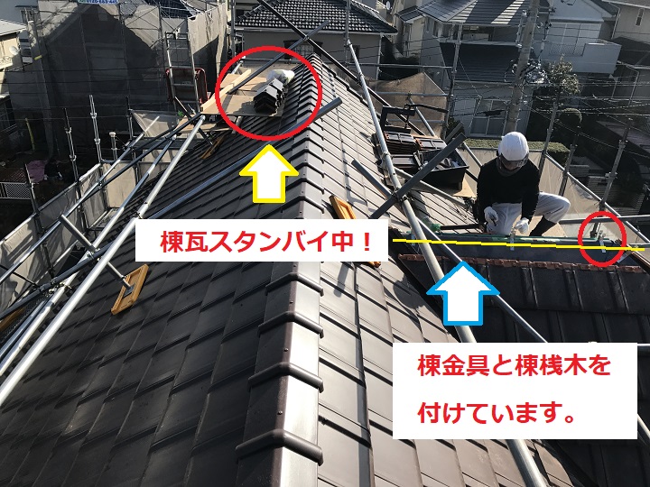棟瓦を付けるための、棟金具と棟桟木を取り付けています。棟金具は、棟瓦を固定するために必要な芯部分のことです。ここに棟瓦を取り付けて、瓦の上からネジで止めます。棟は、1番出っ張っている部分に瓦を葺くので、台風なので結構瓦が飛びやすいんです。なので飛ばされないようしっかり固定します。 ...続きを読む2026/02/19 三田市 瓦屋根から草が生えている?無料調査で雨漏りとの関係性を考察