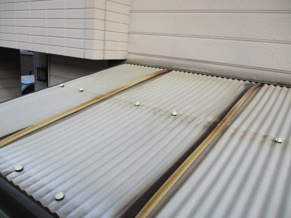鹿沼市でテラスの波板交換工事を追加ご依頼頂きました。 1階のテラス屋根波板の施工目前の状態です。 火災保険適応の雨樋交換工事の完工後、テラスの波板が劣化しているので、交換して欲しいとのご依頼で、追加工事になりました。 既存の波 ...続きを読む2026/04/8 熊本市西区にて屋根カバー工法(Tルーフ)及び外壁塗装工事着工
