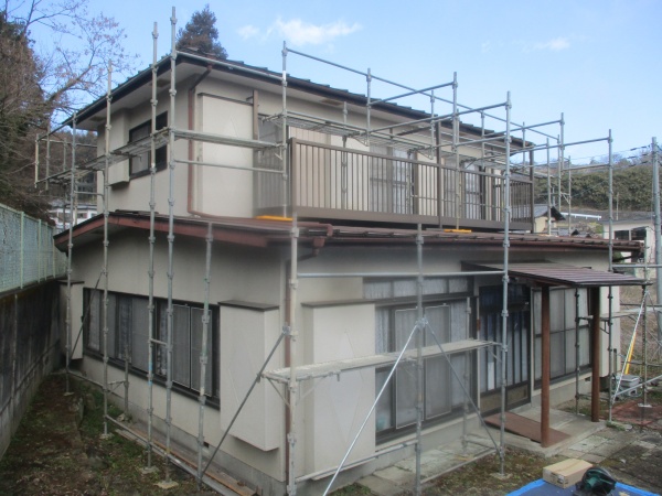 鹿沼市の外壁塗装工事の7日目で部分塗装と雨樋の取り付けをしました。 テラス上の外壁で、部分塗装の為の養生中です。 テラスの波板を外してから、テラス枠に塗料が付かないように軒天と外壁の塗装の為の、養生をしました。 外壁の下塗り ...続きを読む2026/04/8 鹿沼市でバカ棒を使って軒樋の入り隅と呼び樋を取り付けました。