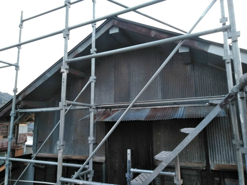 日高市にて、当社で外装施工のお客様。先ず屋根のカバールーフ工事を終えました。せっかくなので駐輪場の波板屋根も新しくキレイにしてさしあげようと、外壁塗装に移行する前に波板を取り外し塗装後に新しい波板を新設しました。 ...続きを読む2025/12/25 阪南市の台風被害で門長屋の外壁と袖瓦破損・漆喰剥がれの現場調査