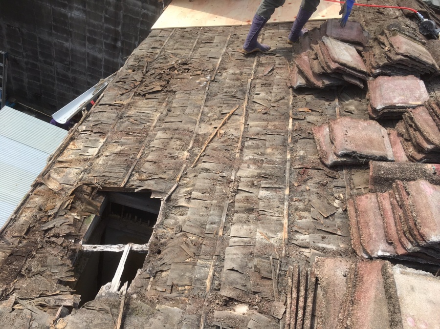 セメント瓦の撤去作業から取り掛かりました。セメント瓦は10年に一度、屋根塗装してあげないといけない屋根材です。素材がセメントなので水を吸水してしまい割れや今回のような激しい劣化に繋がっていきます。解体中に感じた事として、やはり経年劣化がはげしく今すぐ作業が必要な状況でした。非常に危険の伴う作業で ...続きを読む2025/12/25 阪南市で台風後の屋根を調査、瓦屋根の損傷箇所と谷樋の様子を確認