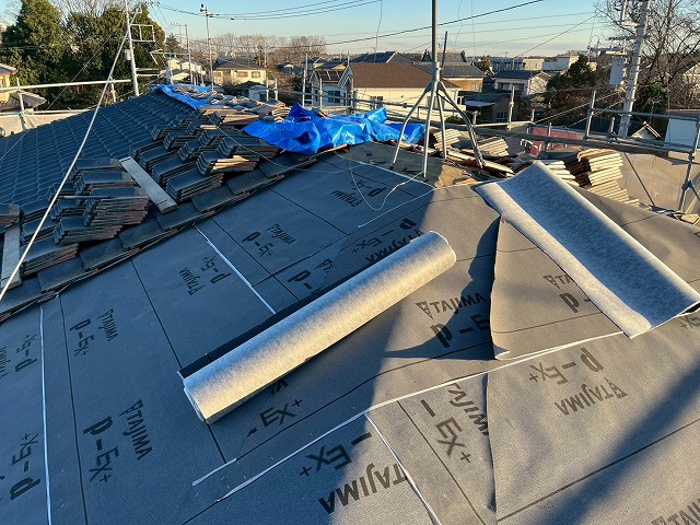 皆さんお疲れ様です。街の屋根やさんつくば稲敷店です。 前回のブログでは、鉾田市の住宅にて、雨漏り修理のために実施している屋根葺き直し工事の瓦桟撤去の様子や下地のダメージ状況などをお伝えいたしました。 今回は、解体を終えた下地に対して行った防水シートの敷設工程について、その施工の様子をご紹介したいと思います。 ...続きを読む2026/02/21 高砂市で雹被害を調査!雨押え板金とリブトタンのヘコミを屋根診断士が無料現場調査