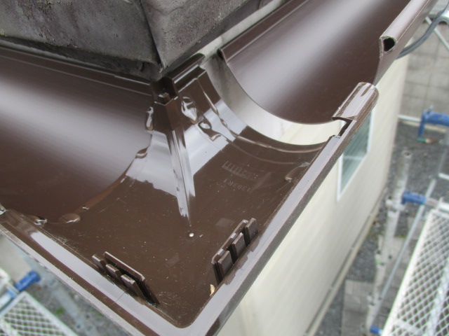 軒樋を繋ぎました。 グランスケアPC-60専用の外曲がりで軒樋と軒樋を90度に繋ぎます。 集水器を取り付けました。こちらもグランスケア専用F型集水器です。通常の集水器と違い取り付けた時凹凸がなく軒樋全体がストレートに見えてスタ ...続きを読む2026/04/9 鹿沼市の外壁塗装工事で上塗り塗装と養生を払いました。