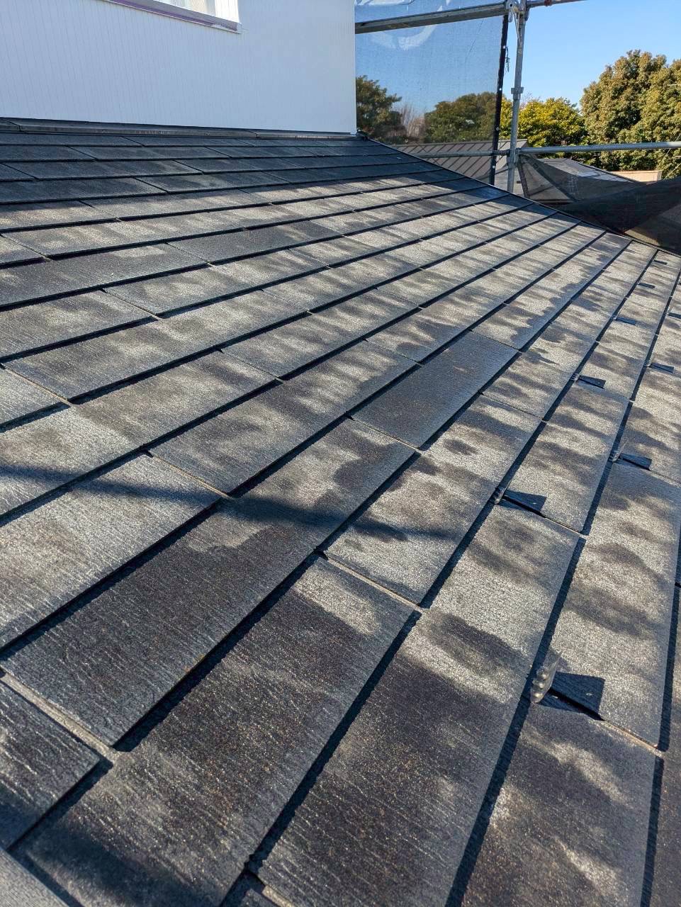 2026/04/9 鹿沼市のコロニアル屋根塗装工事で1階屋根の上塗り塗装をしました
