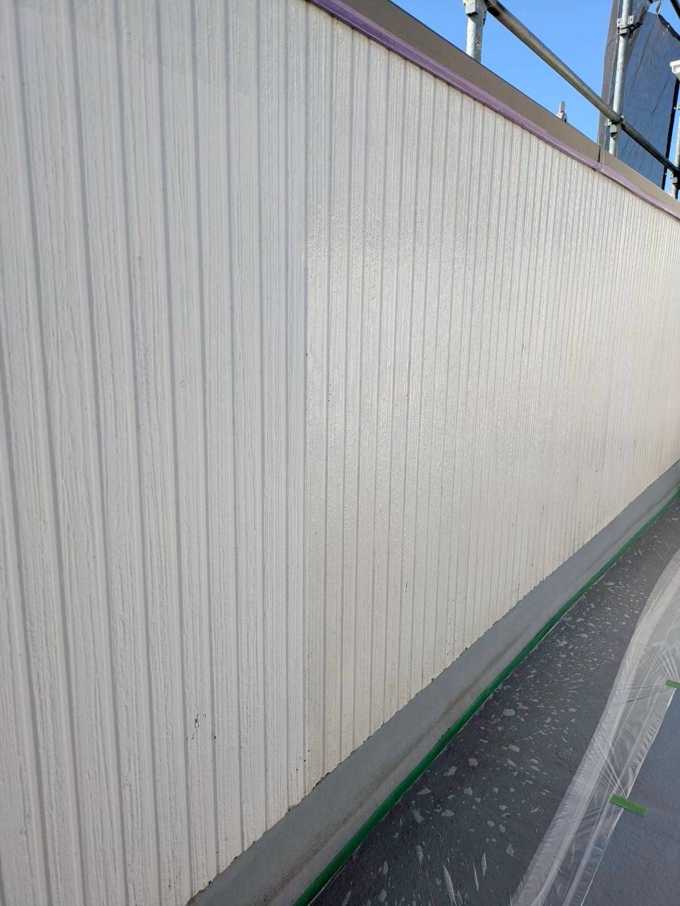上塗り塗装中です。 中塗り塗装が完全に乾燥した事を確認してから、上塗り塗装をしていきます。 今回使用した中、上塗り塗料は関西ペイントのアレスダイナミックTOPです。シリコン樹脂系塗料で外壁素地への雨水の浸入を防ぎ耐久性、耐候性に優れた塗料です。 ...続きを読む2026/04/9 岸和田市で瓦屋根だった庇を耐久性の高いガルバリウム鋼板に葺き替え