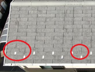 ひび割れが増加していくと次に現れるのは屋根材の欠けです。ひび割れている部分は当然強度も低下しますので、欠けに繋がるのも仕方ありません。小さな欠けであれば現在のスレート屋根材にも見られますが、コロニアルNEOは比較的大きな欠けが生じるのも大きな特徴です。数枚であれば見逃しがちですが全体的に欠損が生じる可能性もありますので、全面の改修メンテナンスを行ったほうが断然オススメです。