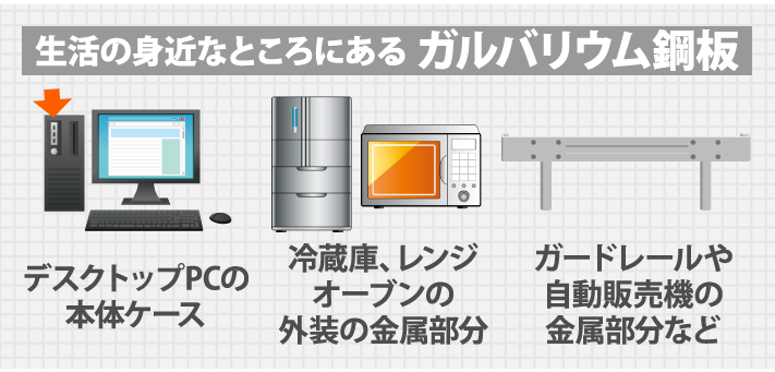 デスクトップのPCケース・冷蔵庫・電子レンジなど家電の外装・道路のガードレールなど実に様々な製品にガルバリウム鋼板は使用されています。