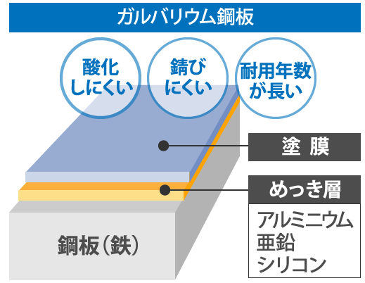 - ●ガルバリウム鋼板とは、アルミニウムや亜鉛、そしてシリコンでめっきされた薄い鉄板のことを指します