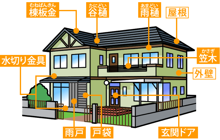 もちろんお住まい周りも屋根・外壁に限りません。屋根に使用される棟板金・谷板金・水切りの為の金具は一般的にガルバリウム鋼板が使用されます。また、ベランダの手すりに被せられた笠木・雨樋・雨戸にガルバリウム鋼板が使用される場合があります。