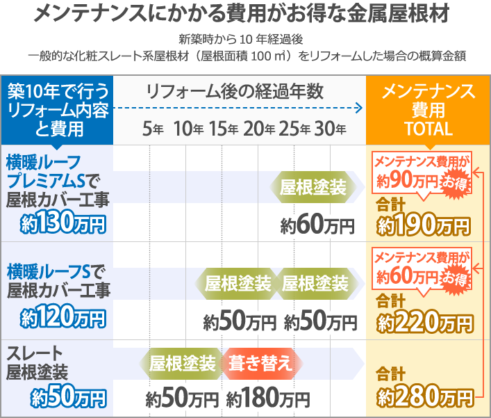 それに対して、ガルバリウム鋼板屋根材の代表的な製品である「スーパーガルテクト」や「横暖ルーフS」ではメーカーにより塗膜15年、赤錆20年、穴あき25年の保証が付いています。あくまで保証であるため、環境・条件次第ではさらに長期の耐用年数に期待することが出来ます。