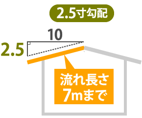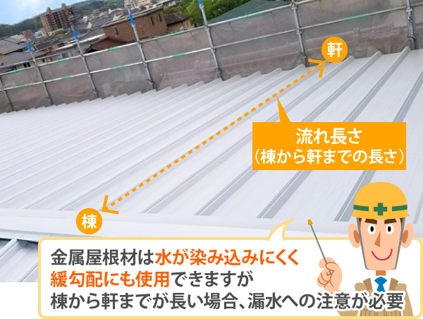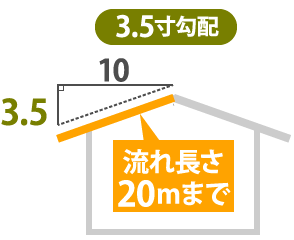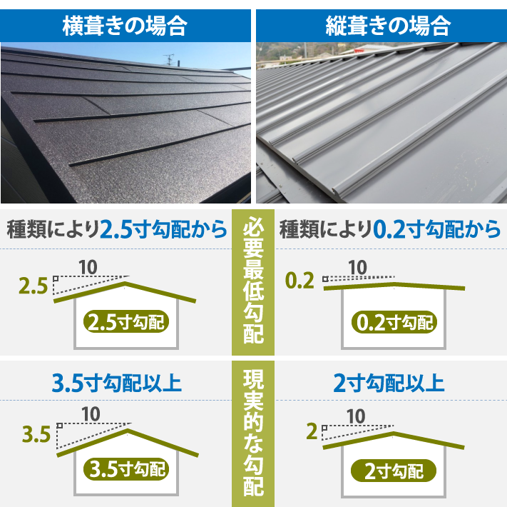 一方、「縦葺き」は棟から軒までを一枚の板金で仕上げていく手法で、水の流れがスムーズである為、わずか2寸ほどの緩い勾配であっても施工可能です。