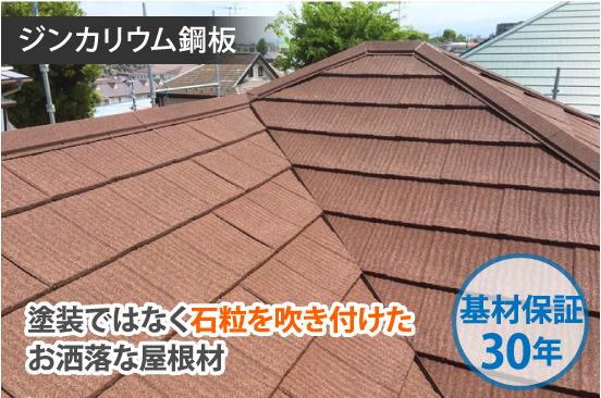 金属製の屋根材には塗装ではなく石粒を吹き付けているものもあり、こちらは非常にお洒落な外観をしています。例えば、ディーズルーフィングのエコグラーニなどがよく知られており、これらは主にジンカリウム鋼板から製造されています。こちらの基材保証は30年と非常に長期です。