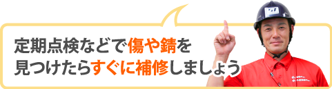 例えば、強風によって飛来物が落下してしまうと傷が出来てしまい、メッキが剥がれてしまいますとその部分から錆が広がってしまいます。定期点検により傷・錆が発見された場合には錆止めと塗料でタッチアップをしてもらいましょう。