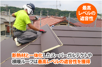 しかし、断熱材が一体型となっているスーパーガルテクトや横暖ルーフは、優れた遮音性・断熱材を備えています。
