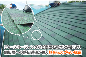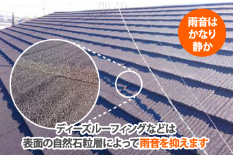 また、表面に石粒がついているディーズルーフィングであれば、温度が上昇しにくく、石粒により音が様々な方向へ拡散される為、雨音もかなり抑制されます。