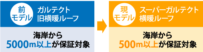 「スーパーガルテクト」「横暖ルーフ(プレミアムシリーズ)」は、エスジーエル素材へのグレードアップにより、従来よりも広範囲(海岸から500m以上の沿岸地域)となりました。