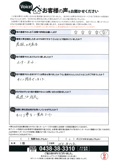 また安易に屋根に上ってしまったせいで、逆に屋 根を傷めてしまう事にもなりかねません。お客様自 身で不具合を増やしてしまっては補修にかかる費用 などを考えると決して喜ばしいことではありません し、危険が伴うだけですのでお控えいただきたいと思います。