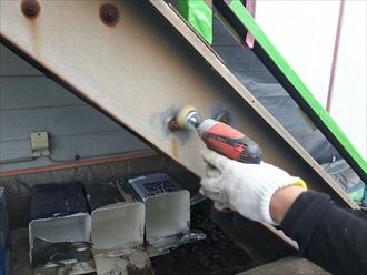 今回の工事ではパラペット部分まで覆ってしまう屋根カバー工法となります。そのため、屋根の高さを上げる必要があります。これまでの屋根の梁が通っている部分の真上に正確に穴を開け、そこに骨組みを取り付けていきます。