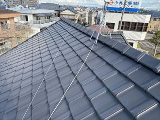 約築40年というお客様より「そろそろ屋根を新しくしたい」とご相談を承りました。何でも「築年数を考えて、そろそろ屋根を軽量化したい」といいうことです。点検したところ、瓦の下に葺土を用いて安定させる土葺き工法で葺かれた屋根でした。この葺き土を撤去し、から葺き(桟葺き)工法に変更すれば、瓦屋根でも総重量を3分の2から2分の1程度にまで減らすことができます。今回はそれに加えて防災瓦を使用し、災害に強い屋根へと変更します。