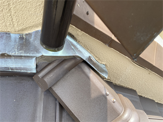 棟瓦が落下しないようにとの配慮からかラバーロック工法がされていました。棟瓦の瓦と瓦の隙間が全てシーリング材で埋め尽くされています。これだと瓦の内部に入った雨水が排出できず、雨漏りへと繋がります。現在、雨漏りしているそうで、瓦のしたの葺き土も湿っているところがありました。