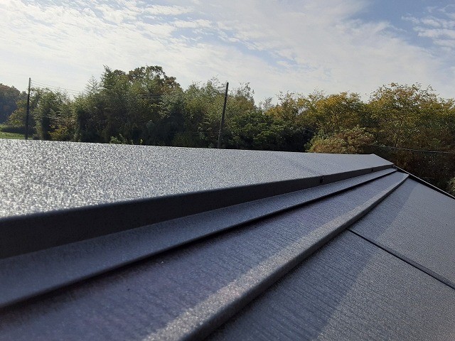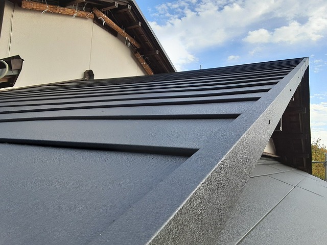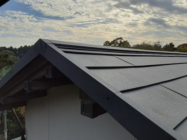 棟板金の設置をもって、大屋根のスーパーガルテクト葺き替え工事はすべて完了です! お客様の不安だった雨漏りの心配もなくなり、地震にも強く、断熱性も向上した屋根へと生まれ変わりました。