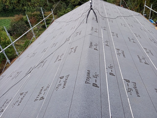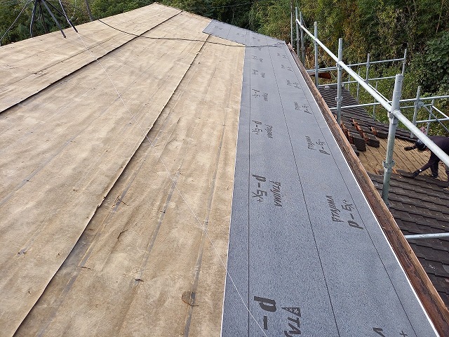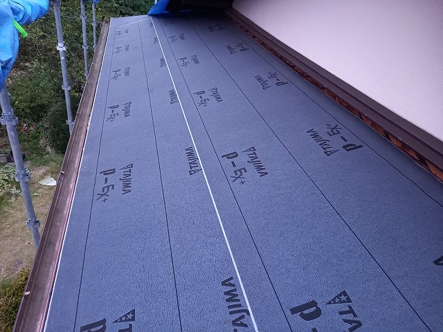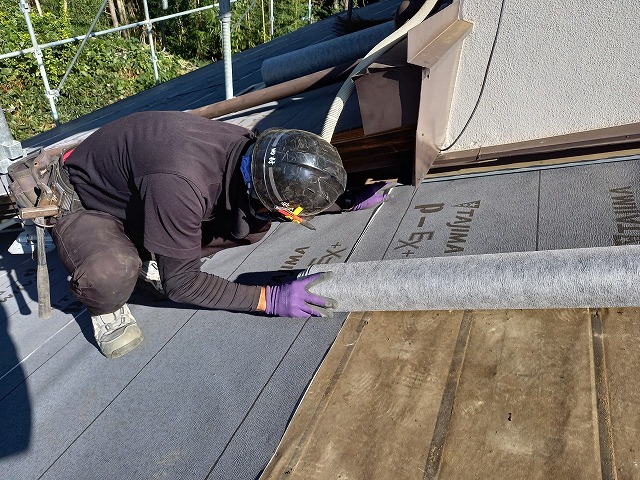その後、防水対策の要となるルーフィング(防水シート)の敷設を行いました。今回は、TAJIMA社製の高性能な『PカラーEX+』という改質アスファルトルーフィングを使用。高い防水性と耐久性を持ち、空気の巻き込みによる膨らみを防ぎながら、隙間なく丁寧に敷き詰めていきました。このルーフィングが、新しい屋根の防水性能を最大限に引き出し、雨漏りから家を守る最後の砦となります。