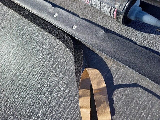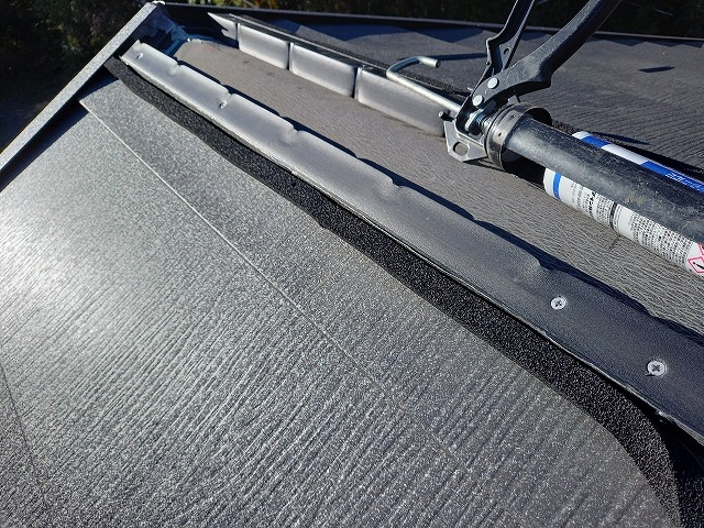 棟部分に棟板金を取り付ける前に、その下地となる樹脂製の垂木(たるき)に、スポンジ状のシーラーを貼り付けていきます。