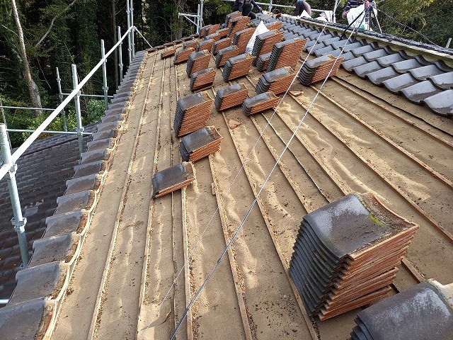 大屋根と同様に、下屋根でも一枚一枚、瓦を丁寧に剥がしていく作業が続きます。長年の間に溜まった土埃やゴミをきれいに掃き出しながら、下地を確認していきます。