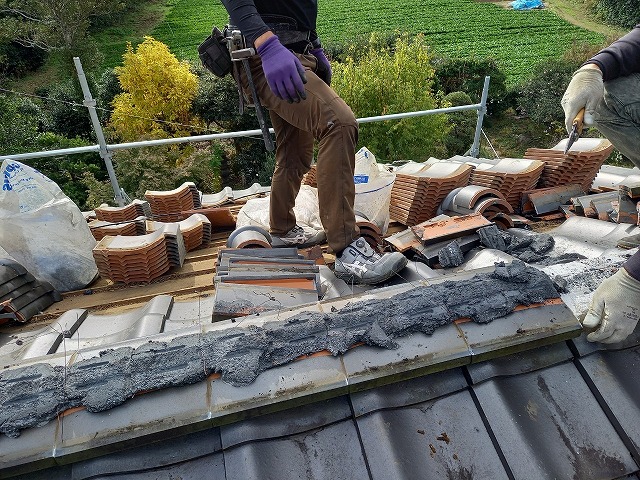 まずは、2階部分の大きな屋根から着手します。屋根の頂点にある棟(むね)を撤去し、そこから丁寧に瓦を剥がしていく作業です。
