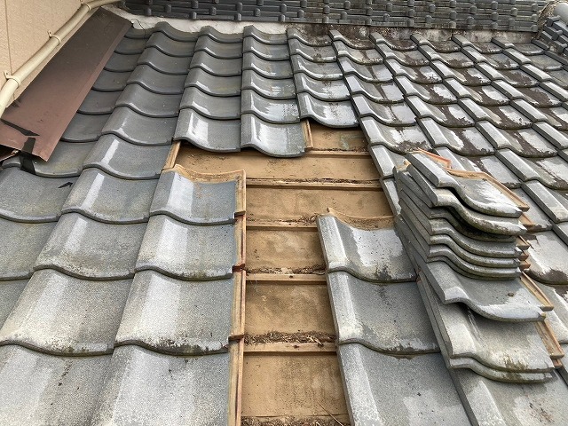 瓦は一枚一枚が重く、熟練の技術が求められる作業です。既存の瓦を安全に、そして迅速に剥がしていきます。