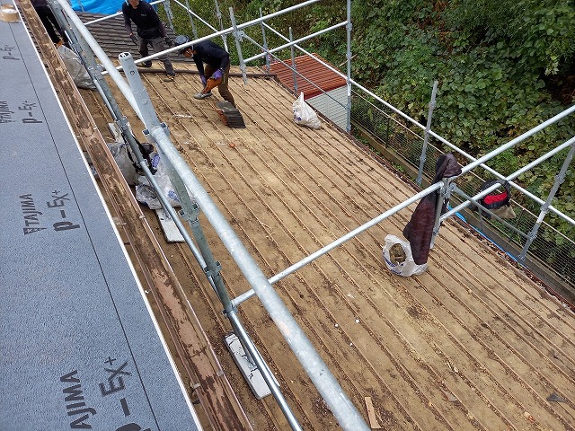 下屋根も丁寧に瓦を撤去して防水シートの敷設を行います