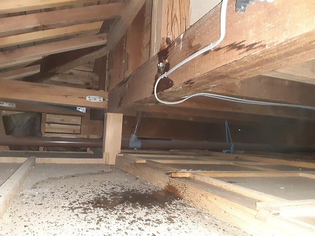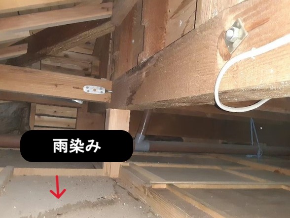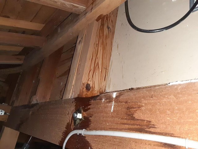 天井裏を点検してみると、やはり広範囲にわたって雨染みができていました。天井裏まで水が回っているということは、雨漏りが以前から進行していた可能性が高いです。