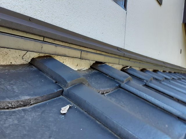 漆喰(しっくい)の剥がれ 瓦をしっかりと固定している漆喰が劣化して剥がれてくると、瓦自体が不安定になります。強風の際に瓦が飛ばされてしまう危険性も高まり、非常に危険です。