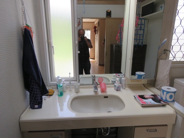 設置した当時は、最先端の洗面台だったんでしょうが、今では収納庫が鏡の裏側に有り見た目が綺麗に成って居ります。