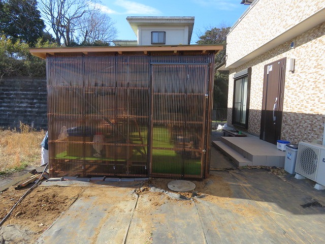小屋の外壁を茶色のポリカ波板を採用致しました。