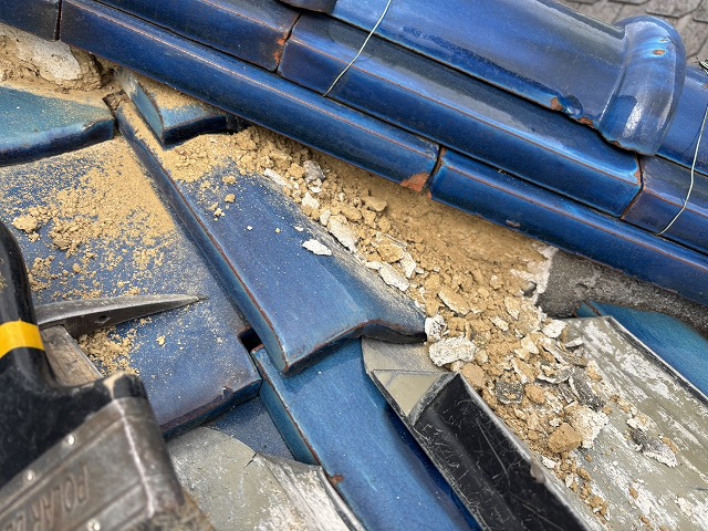 松原市の青瓦屋根 点検と補修の実例 破損瓦と漆喰を補修