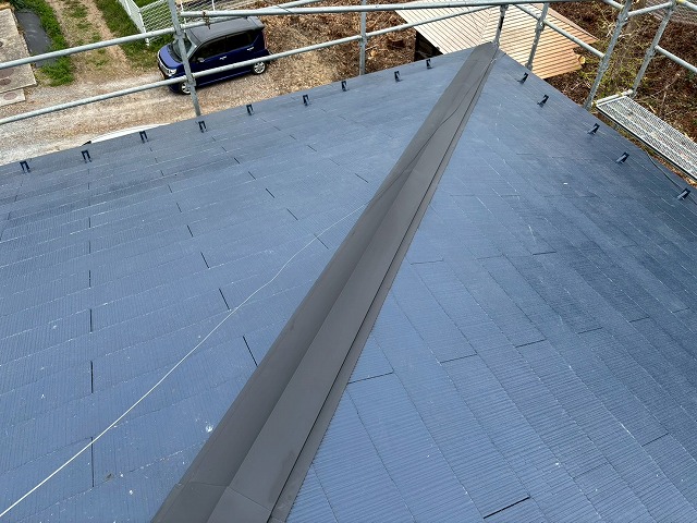 ガルバリウム鋼板製の棟包み板金を軒先から順番に設置していきますよ(^^)