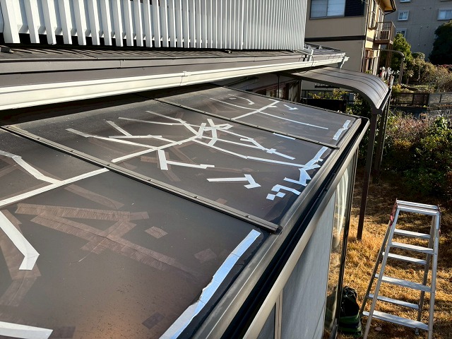 サンルーム屋根のパネル全体にひびが広がっており、これまでに応急的な補修を行った跡も多く確認できる状態でした。
