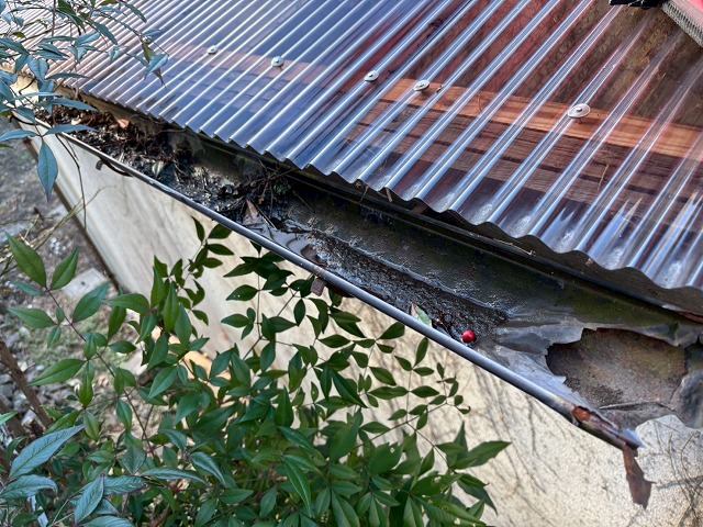 施工前の状態では、車庫に設置されている軒樋の一部は腐食により脱落していました。