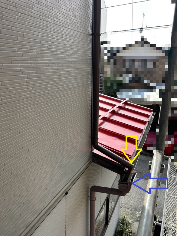 コチラは軒樋から下屋根(赤い屋根)に沿わせて雨どいを設置し、下屋根の集水器(青い矢印)に雨水が流れるように施工しました!