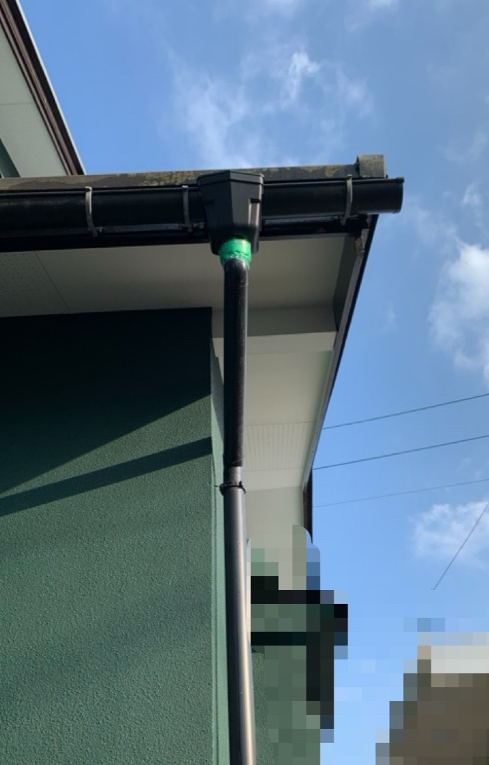 集水器と呼び樋の繋ぎ目がズレており、雨水が流れるようテープで養生されていました。