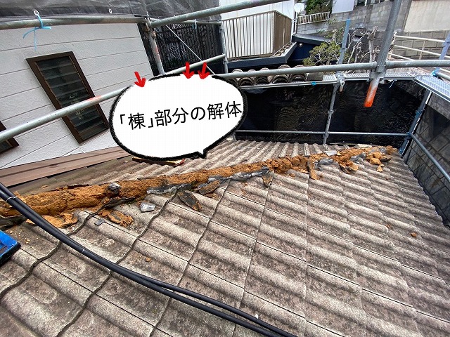 棟と呼ばれる瓦は屋根の斜め部分を解体していきます!