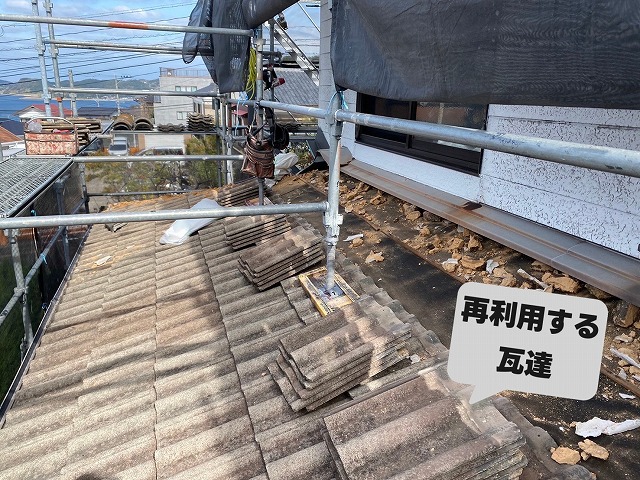 割れてしまわないように注意しながら、再利用する瓦はまとめてきれいに積み上げて保管します。
