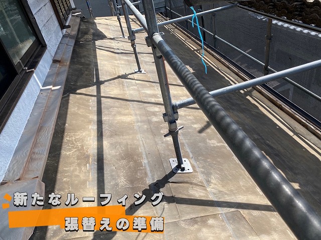 破れている箇所や浮いている箇所を確認しながら、既存ルーフィングをすべて剥がしていきます!