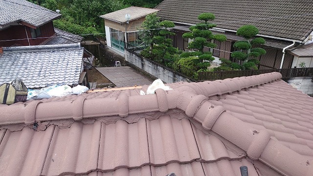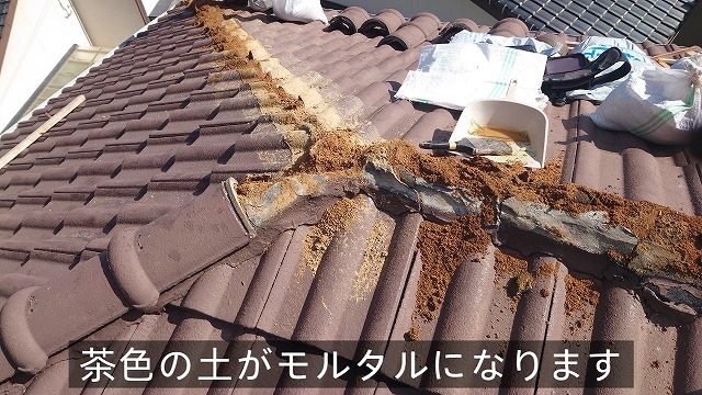 棟部分には棟瓦が施工されており、その下にはモルタルが使われています。