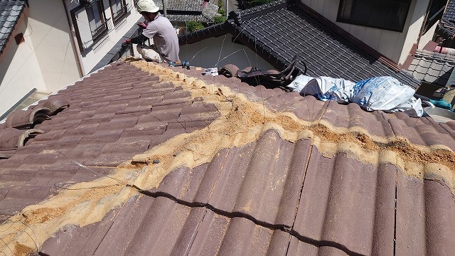 棟積み直し工事では、まず既存の棟瓦を一度すべて解体します。