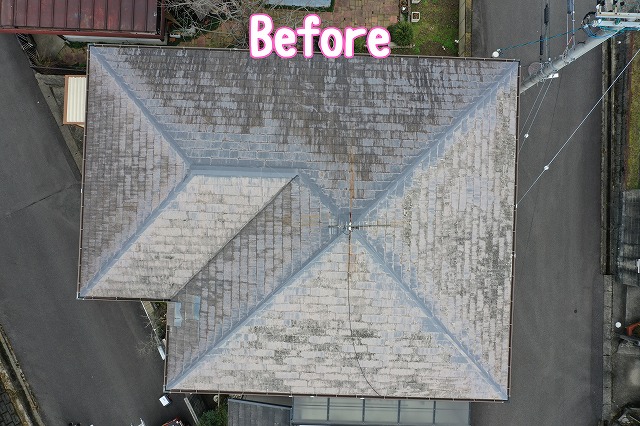 上空から確認すると、屋根は複数の面が組み合わさった形状で、谷部や棟まわりなど雨水が集まりやすいラインがはっきり見て取れました。表面は経年による色ムラや汚れが広がっており、全体として「疲れ」が出ている印象です。屋根の形状が複雑なほど、排水の要所である谷や取り合い部の健全性が重要になるため、細部の確認を優先して進めました。